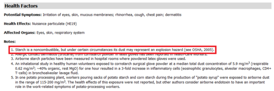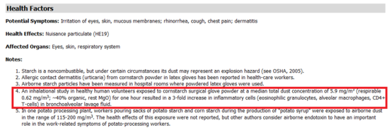 根据知乎网友梅洋汤的回答,她参考了美国劳工部的网站,里面对玉米淀粉的介绍里有这样一项——健康影响。其中有这样的案例: