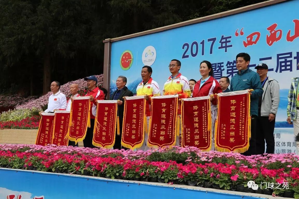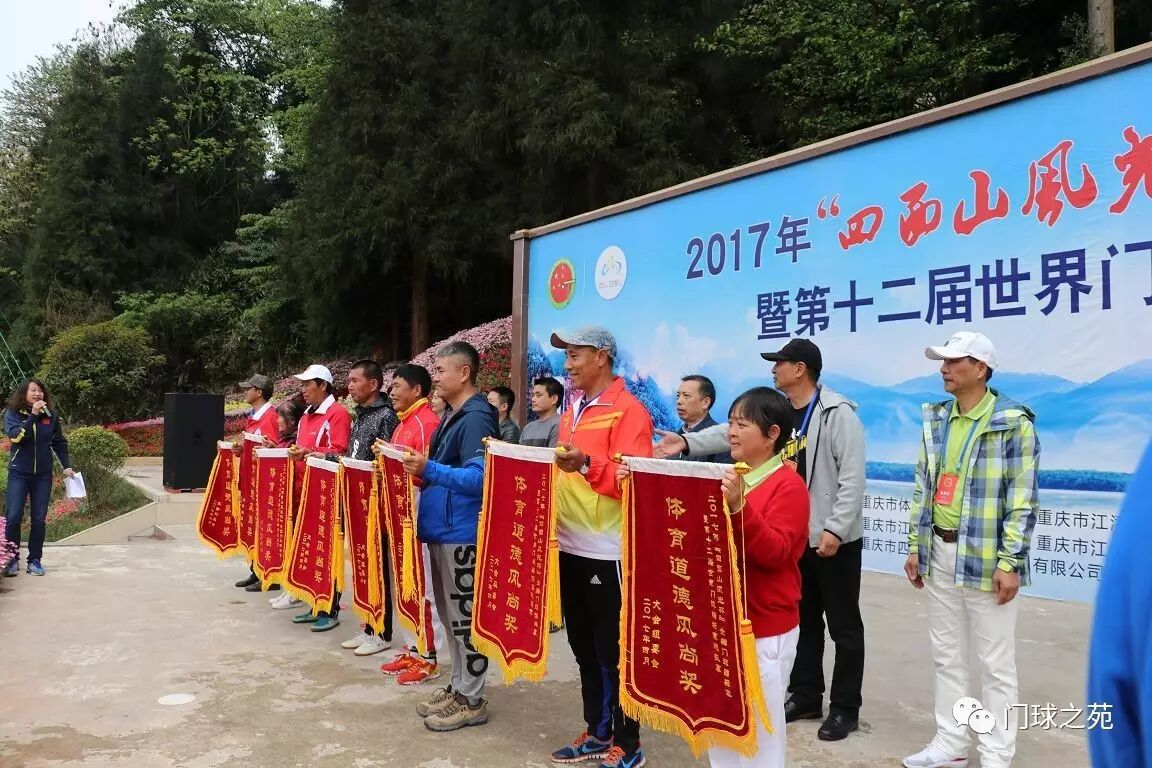 中国门球协会特邀副主席 马金凤; 重庆市门球协会副主席、秘书长余晓琳; 重庆市江津区四面山镇人大主席张福炼;重庆市江津区四面山镇副镇长、武装部长周思彬;重庆市江津区四面山镇副镇长张峻峰;重庆市江津区门球协会秘书长吴泽第;本次大赛仲裁关键;本次大赛裁判长刘林箭为获得体育道德风尚奖的队伍颁奖。