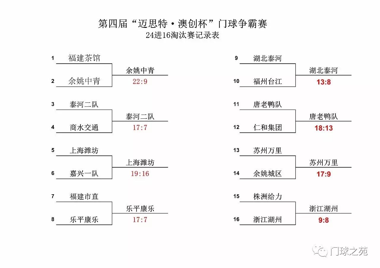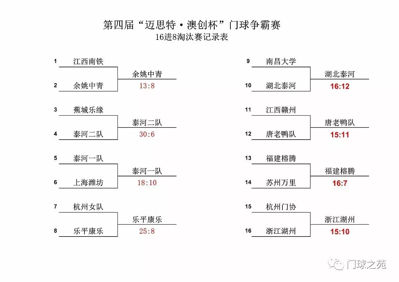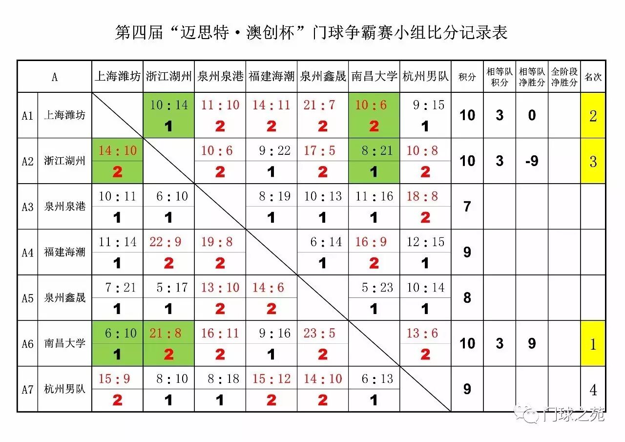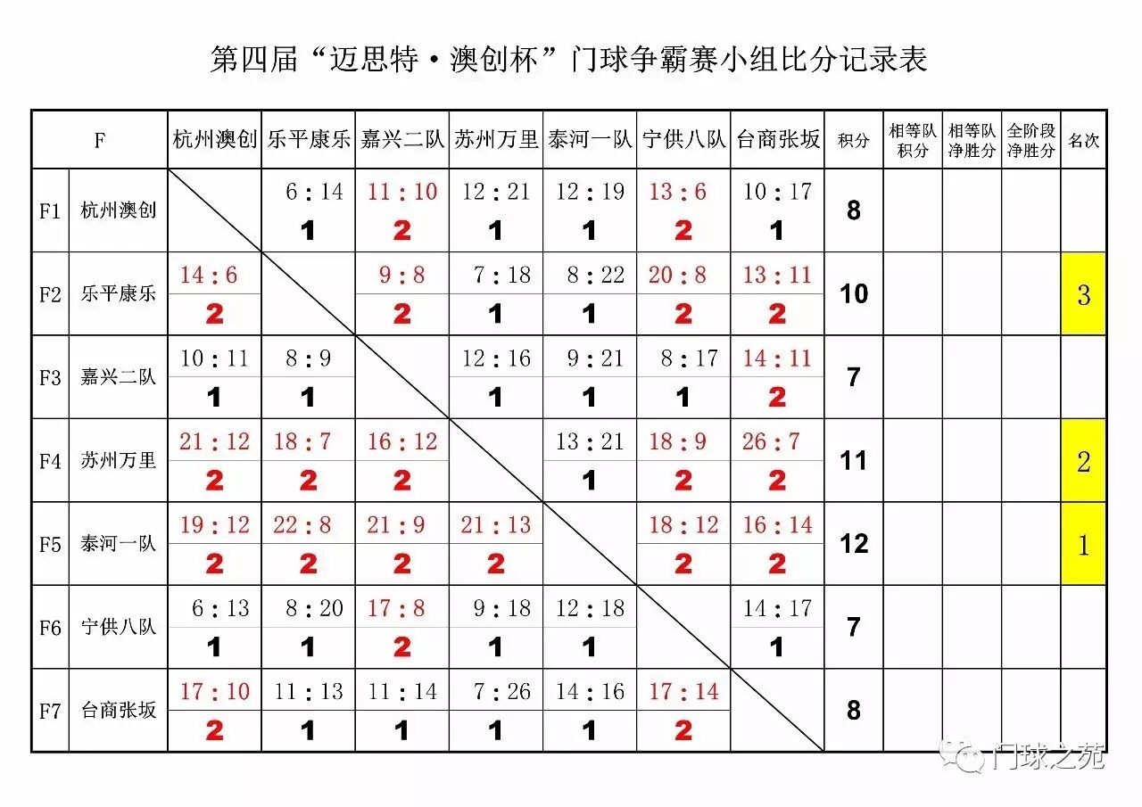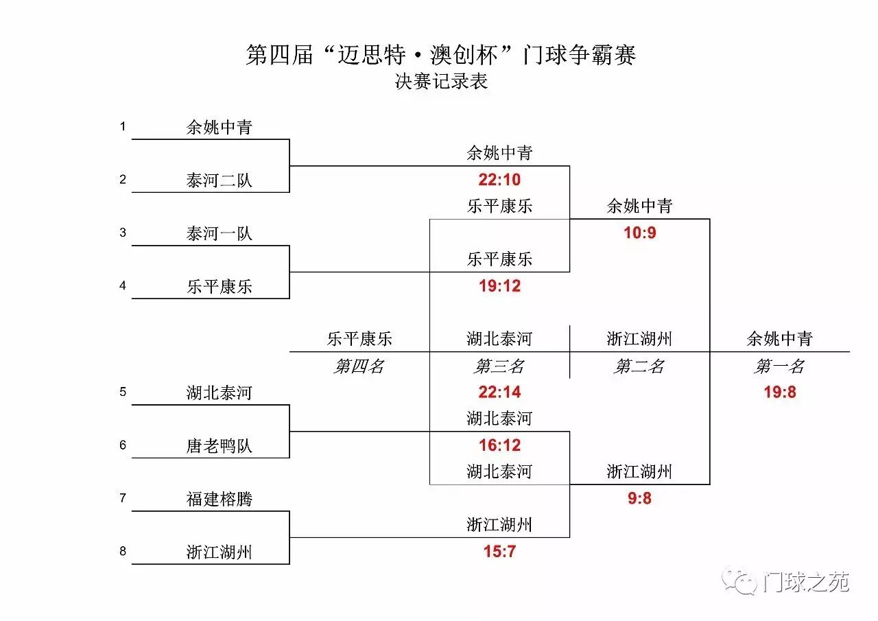 第四届“迈思特·澳创杯”门球争霸赛圆满闭幕 经过3天的激烈角逐,第四届“迈思特·澳创杯”门球争霸赛于6月13日中午落下帷幕,浙江宁波余姚中青队获得冠军,浙江湖州队获得亚军,湖北泰河队获得第三名,江西省乐平康乐队获得第四名;泰河一队、泰河二队、唐老鸭队、福建榕腾队并列第五名。