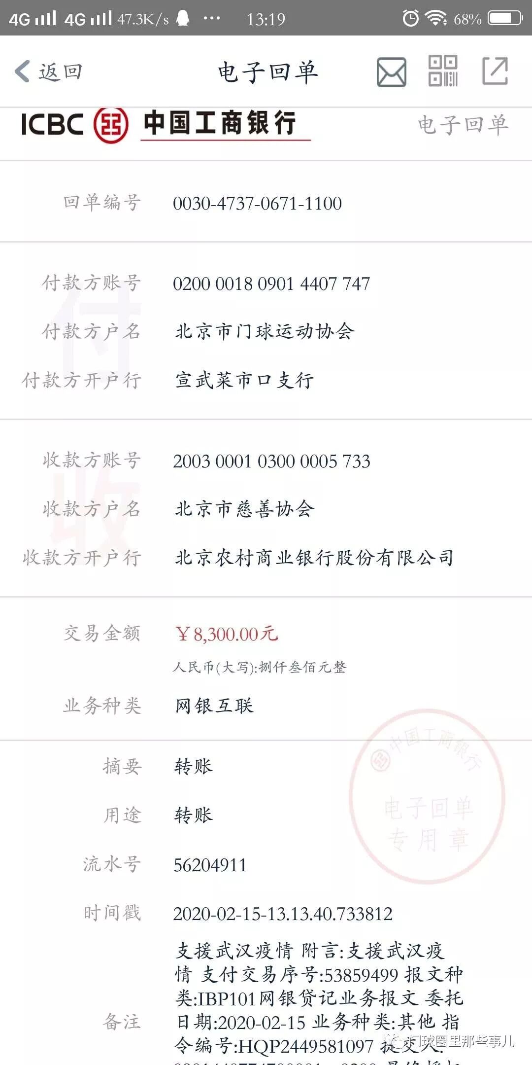 4、疫情期间北京市门球运动协会党支部委员会组织党员、工作人员为支援武汉疫情募捐,2月15日市门协将正式党员7名、流动党员3名、入党积极分子2名、群众1名捐助的善款8300元人民币转到了北京市慈善协会的指定账户,为抗击疫情尽了绵薄之力。