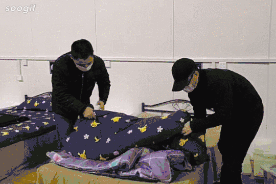 武汉市硚口区检察院干警正在整理床铺,助力搭建方舱医院。
