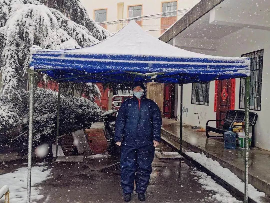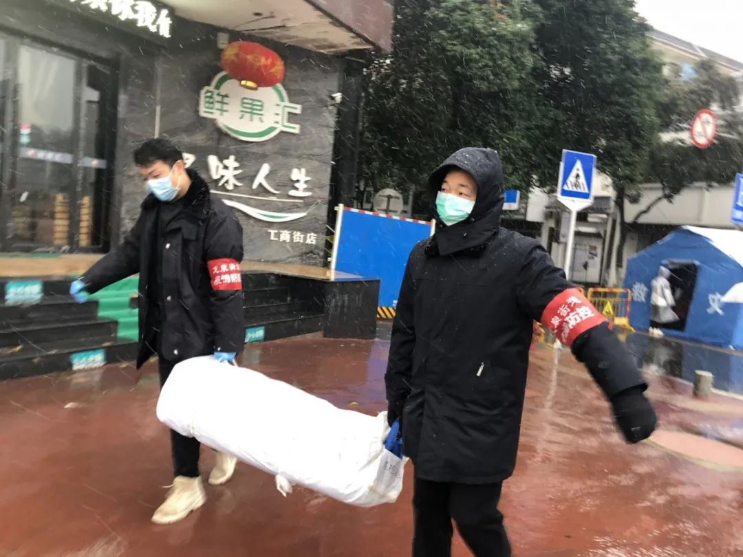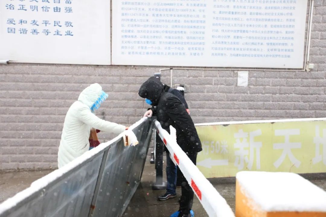 2月15日早晨,大雪纷飞,荆门市东宝区检察院干警在南门社区进行卡口值守工作,冒着风雪积极搬运防疫物资。