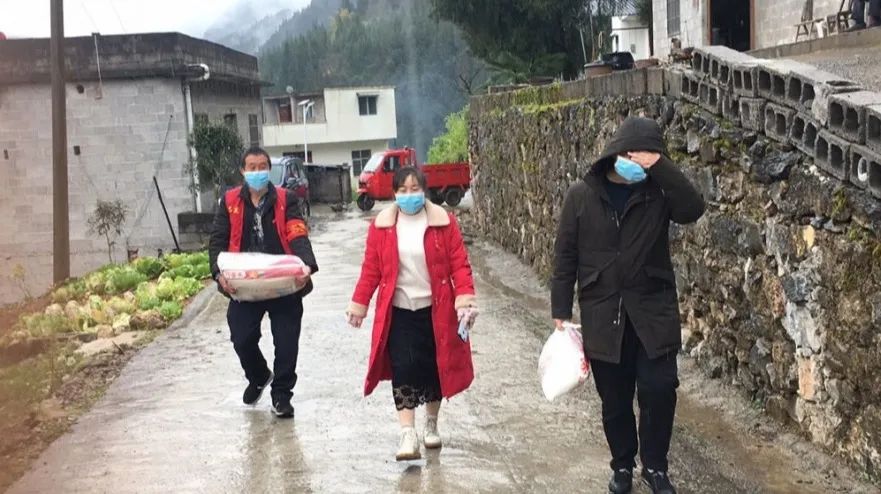 巴东县检察院干警驻大坪村尖刀班成员与志愿者一同将购买的生活物资交到该村4组贫困户手中。