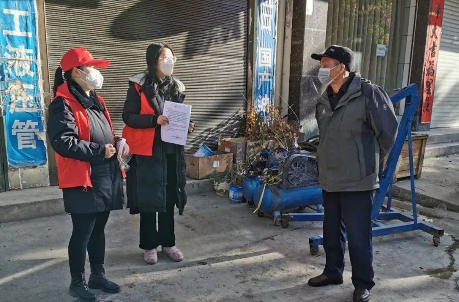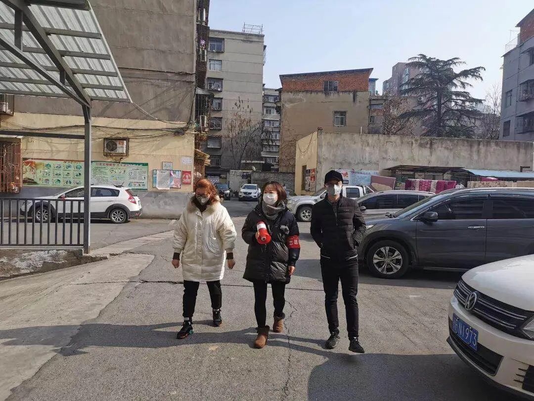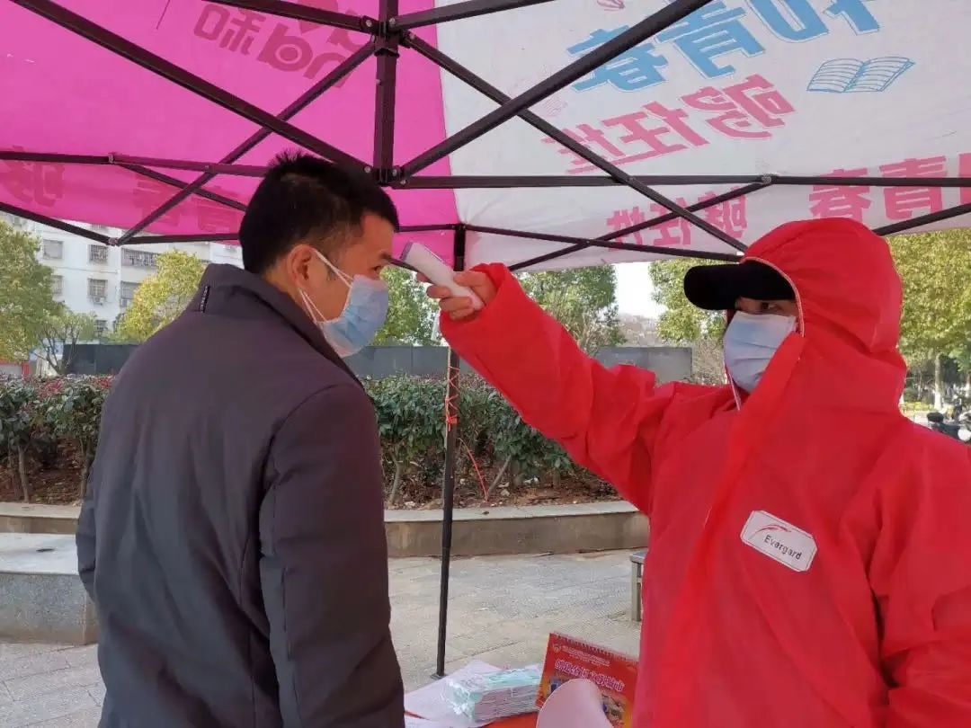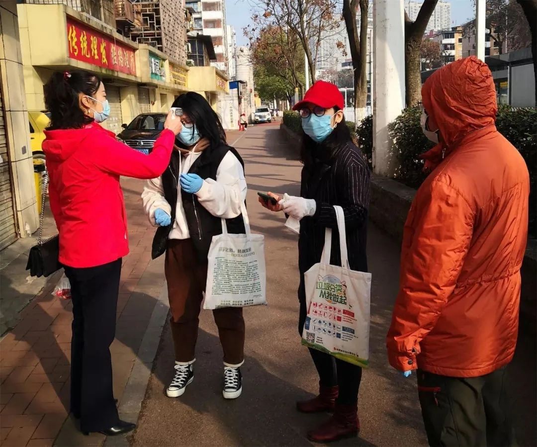 咸宁市检察院干警在车站路社区值守管控,为出入居民测量体温,向他们宣传防疫科学知识。