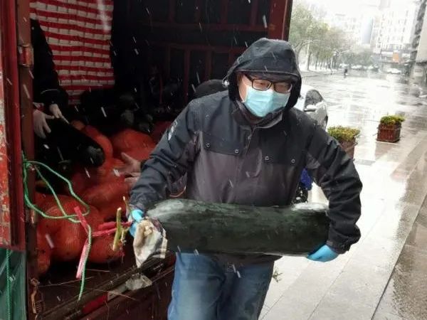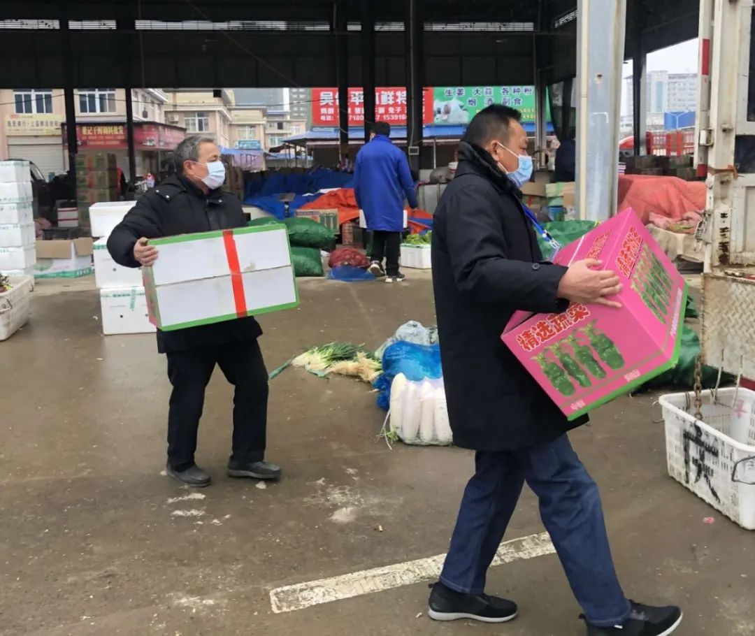 咸宁市咸安区检察院干警在值守的亿丰农贸市场,帮助爱心商户搬运捐赠蔬菜。