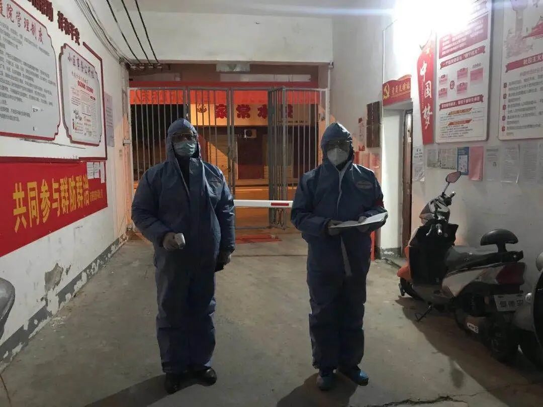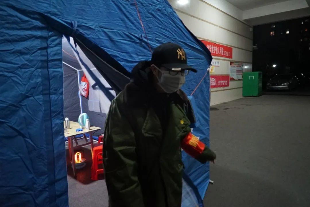晚22点,鄂州市检察院干警在莲花雅苑小区值守时,走出帐篷巡查各楼栋是否有人员进出。