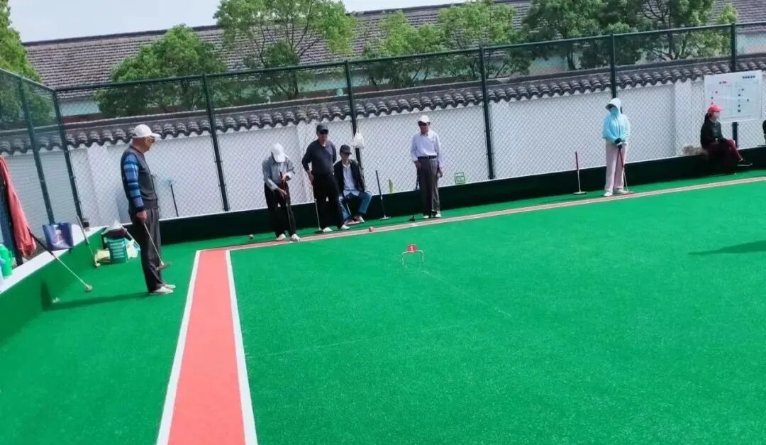 今年,门球场开放后,83岁的丁群人老书记天天早上和球友们一起练球、打比赛。