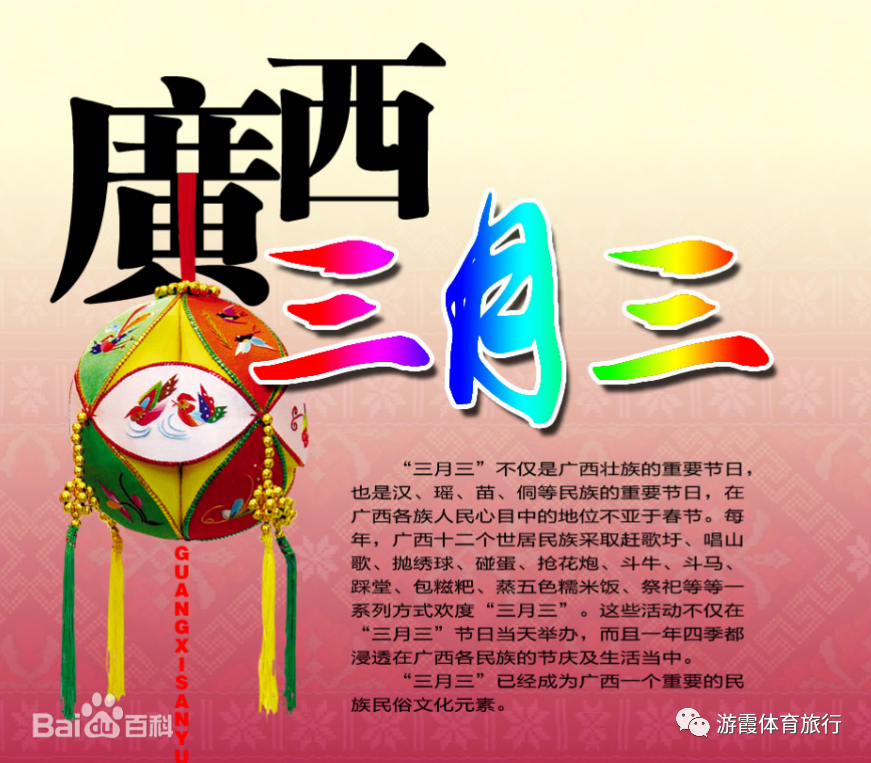 气排球、门球赛规程在最后: 农历三月三,亦称“上巳节”,是中华民族的传统节日,其中以汉族、壮族、苗族、瑶族为典型。三月初三在中国西南地区的一些少数民族地区,仍是一个隆重而盛大的节日。 “三月三”不仅仅是单纯的壮族传统踏青歌节,也是壮族祭祖、祭拜盘古、布洛陀始祖的重要日子。每到三月三时节,壮族青年男女聚集街头欢歌、汇聚江边饮宴。同时,“壮族三月三”不仅是壮族重要的传统习惯节日,也是广西汉族、瑶族、侗族、苗族等民族传统节日。 [1] [15] 壮族过三月三大多是赶歌圩,搭歌棚,举办歌会。青年男女们对歌、碰蛋、抛绣球,谈情说爱。相传为纪念壮族歌仙刘三姐而形成的节日,故又称“歌仙节”。壮族通常在三月三蒸五色糯米饭。另外,艾糍粑、粉蒸肉、黑糯米酒是广西“三月三”的特色食品 [16] 。壮族“三月三”习俗,很多人只知道对歌谈情,其实壮族“三月三”习俗有很多,抢花炮、抛绣球、吃五色糯米饭等也是有趣的节日习俗。 [6] 节前家家户户准备五色糯米饭和彩蛋。人们采来红兰草、黄饭花或黄栀子、枫叶、紫蕃藤,用这些植物的汁浸泡糯米,做成红、黄、黑、紫、白五色糯米饭。相传,这种食品是深得仙女们的赞赏后流传下来的;也有人说是祭祀歌仙刘三姐的。吃了这种饭,人丁兴旺,身体健壮。 [6] 在农历三月初三以及秋收之后,广西一些少数民族地区民间会自发组织抢花炮运动。参与抢花炮的每支队有8人,队员通过突破、挡人、变向、快冲等方式冲进对方炮台,将花炮放入算得分。规则类似于西方的橄榄球运动,故被称为“东方橄榄球”。传统的“花炮”是一个铁制圆环,直径约5厘米,外用红布或红绸缠绕。比赛场地通常设在河岸或山坡上,不限人数,也不分队数,每炮必抢,三炮结束。 [6] 歌圩的绣球是姑娘们在节前赶制的工艺品,制作工艺都很精巧,个个都是丝织工艺品:十二花瓣连结成一个圆球形,每一片花瓣代表着一年中的某个月份,上面绣有当月的花卉。有些绣球做成方形、多角形等。绣球内装豆粟或棉籽。球上连着一条绸带,下坠丝穗和装饰的珠子,象征着纯洁的爱情。 [6] 打扁担是传统的自娱自乐活动,每一个壮家人都是“打着堂”的演员,妇女的动作轻巧优美,男子的动作刚劲有力,自娱自乐的“打着堂”,寄托着壮族人民祈望丰收的愿望。 打扁担的舞蹈形式有双人舞、四人穿花、多人穿花等各种套式。舞者多为双数。表演者手拿扁担,围在长凳或舂米槽旁,有节奏地时而敲打板凳,时而互相撞击扁担。 [6] “三月三”歌圩是男女青年进行交际的好时机。每逢歌圩,方圆数十里内的男女青年聚集在歌圩点。小伙子在歌师的指点下与中意的姑娘对歌。通常是男青年先主动唱“游览歌”,观察物色对手,遇到合适的对象,便唱起见面歌、邀请歌。女方若有意就答应。男青年再唱询问歌,彼此有了情谊,唱爱慕歌、交情歌。歌词皆即兴发挥,脱口而出。若姑娘觉得眼前的小伙子人才、歌才都满意,便趁旁人不注意,悄悄将怀中的绣球赠与意中人,“他”则报之以手帕、毛巾之类的物品,然后歌声更加甜蜜,遂订秦晋之好。 [6] 广西的一些少数民族素来有在节日庆典或祭祀中击打铜鼓的习惯,这一风俗一直沿袭至今,东兰、天峨等地壮族群众每年过“三月三”和春节,都安、巴马、大化等地瑶族群众过祝着节,南丹瑶族举行葬礼祭祀,南丹中堡苗族过春节或遇上喜庆时都要以击铜鼓的方式表示庆贺或悼念之情。 [6] 彩蛋是把熟鸡蛋染成彩色用以传情之物。小伙子在歌圩中手握彩蛋去碰姑娘手中的彩蛋;姑娘如果不愿意就把蛋握住不让碰,如果有意就让小伙子碰。蛋碰裂后两人共吃彩蛋,这就播下了爱情的种子。如今,碰彩蛋有了“碰碰碰,碰出好运气”的意头。 侗族侗族“三月三”又名“播种节”、“讨葱节”、“花炮节”。侗家传说,古时他们总是以桐树开花时为插秧节。但有一年桐树没有开花,结果误了农时,只好逃荒到报京一带。为吸取过去的教训,每到三月三人们便吹芦笙唱歌、走访亲友,并相互提醒该忙农事了。侗族多于三月三这天举行抢花炮、斗牛、斗马、对歌、踩堂等活动,故亦称“花炮节”。 [7] 瑶族瑶族的三月三为纪念民族英雄,人们把这天取名为三月三,又名“干巴节”。每年三月三之前,瑶族男人都提前一个星期到老林狩猎、捕杀野兽,下河捞鱼摸虾,且烤成干巴带回家,按户分配,共享收获的欢乐。妇女们上山采摘小靛叶等天然染料,煮水后染成红、黄、蓝、紫4种颜色的糯米饭,用于敬献盘古。节日当天,瑶族人民放下手中的农活,集体休息1天,男人们读经书、喝酒、娱乐,姑娘和小伙子们则相约到寨子边的荒山上、树林里对歌、玩耍、谈情说爱。 [7] 布依族每年的农历三月初三,是贞丰、望谟等地布依族的民族传统节日。在传统的观念中,为了使全寨人达到“禳灾祈福、寨子安宁、风调雨顺、五谷丰登”的目的,祖祖辈辈生活在北盘江畔的贞丰布依族人民在农历三月初三这一天都要举行相应的祭祀活动。 畲族三月三活动 [19] 畲族以三月三为谷米的生日,家家吃乌米饭。传说,唐代畲族英雄雷万兴率起义军抗击官军围剿,以乌稔果充饥而军威大振,于三月三这天突围成功,连战连捷。畲民为纪念此事,每年三月三要吃乌米饭,集会对歌。 [7]在畲族民众中,三月三是可以与春节相提并论的重大节日。此日,家