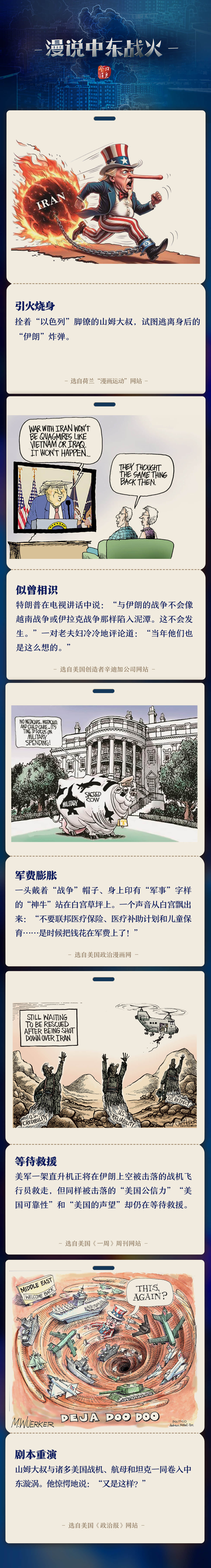 美以伊冲突已经持续近2个月,特朗普宣称不会让美国陷入战争泥潭,白宫力推军费膨胀却削减民生开支,而外媒笔下的漫画,以直白犀利的笔触,戳破了战争的荒诞与代价。