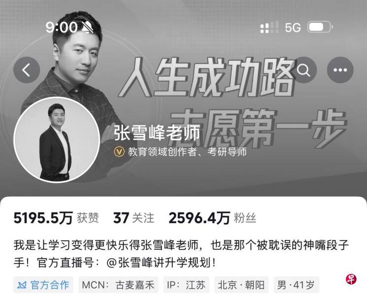 张雪峰是考研与高考志愿填报咨询名师,在中国各大社媒坐拥6000万粉丝,拥有庞大商业帝国。