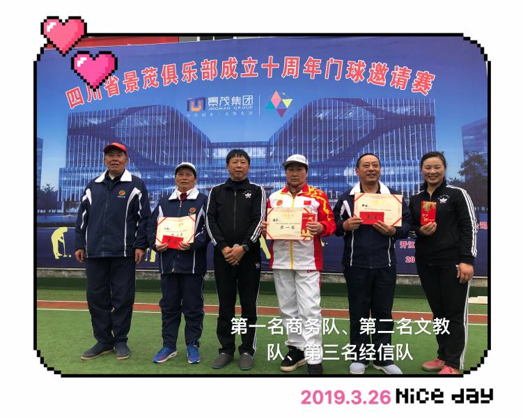 四川省景茂俱乐部门球邀请赛于2019年3月25日至26日在开江县体育局门球场举行,来自全县城乡的8支门球队参加了这次比赛。经过两天28场的紧张比赛,于26日下午收杆。最终商务队取得第一名,文教队获第二名,经信队获第三名,其余各队获并列第四名。