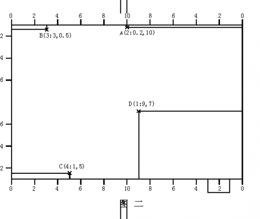 以终点柱为原点,做一、三线的垂线为x轴,做二、四线的垂线为y轴,建立直角系统。y轴至一线内的点x值为正值,y轴至三线内的点x值为负值,x轴至二线内的点y值为正值,x轴至四线内的点y值为负值。请看图一,A(7.5,5.5)位于一门后的接球区,口令为“到7.5,5.5”。B(-9,0)位于三角半距三线1米处。C(-8,-7)位于四角。D(4,-3)位于过三门球的接应区。 这种方法只要说出两个数字就可以指明场上位置,对距终点柱不太远的点位比较好用,但是,场上的球多数是往边角打,往往要把这两个数字换算成到边线的距离,就有些不便了。 二.边角座标系 以四个角的顶点为原点,两条边为轴各自建立直角座标系,逆时针方向命名x、y轴,这时只要说出三个数字就可确定点位,笫一个数字是角号,第二、三两数字是座标值。请看图二,A(2:0.2,10)就是二门一号位,口令为“到2:0.2,10”。B(3:3,0.5)是指距三线3米、距二线0.5米的点位。C(4:1,5)距四线1米、距三线5米。D(1:9,7)距一线9米、距四线7米,就在终点柱向一角方向1米多的地方。 三、边线距离法 用两对数字指示点位,每对数字的笫一个数字表示边线号,笫二个数字表示到该边的距离。请看图三,A(1:0.5,2:5)距一线0.5米,距二线5米,在一门的斜后方,靠近一线,口令为“到1:0.5,2:5”。B(2:2,3:1)指二门后距三线1米的点位。C(3:8,4:0.2)位于三门一号位、距边线0.2米。D(4:0.5,1:0.5)为一角,距两边线均为0米。