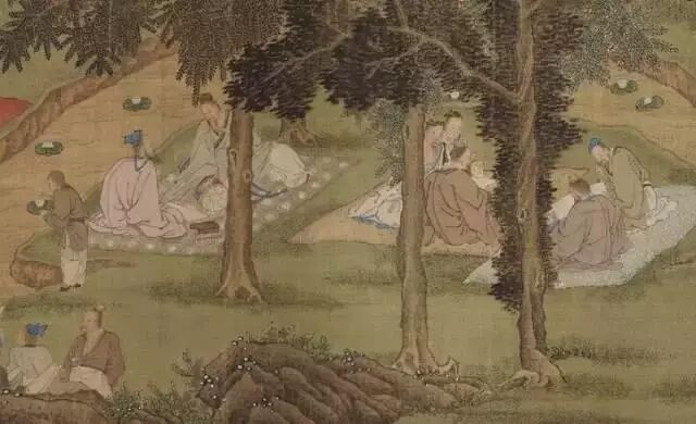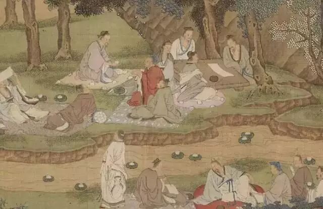 大家散坐在蜿蜒曲折的溪水两旁,然后由书僮将斟酒的羽觞放入澄澈的溪中,让其顺流而下,若觞在谁的面前停滞了,谁得赋诗,若吟不出诗,则要罚酒三杯。
