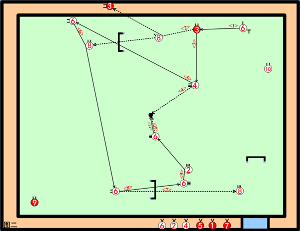 白方,3分球2号在三门后约3米左右、稍偏中柱一方;3分球4号在中柱与二角之间、偏中柱一方;1分球6号在二角前约3米;1分球8号在二门前;2分球10号在一线中与二角之间、距一线一米左右。