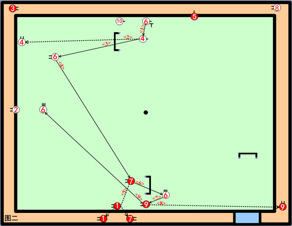 在我执打的6号起杆前,我就作好了教练让我击打4号、闪送4号进二门,自球进二门后、必打三门前7号的思想准备。因为我方8号在界外,对方7打9、9号可以满场飞,对我方威胁极大(9送10 ;1号又是王牌球)。
