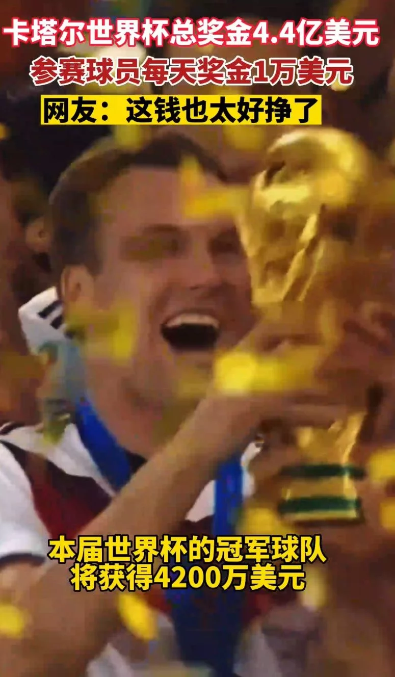 据大众网·海报新闻消息,2022卡塔尔世界杯,是世界杯历史上第一次进入中东地区。总奖金池4.4亿美金,冠军可获得4200万美元奖金的奖励,也是世界杯有史以来最高的冠军奖金。4200万美元,是本届世界杯冠军能够获得的待遇。除此之外,亚军将得到3000万美元,第3名和第4名将得到2700万美元和2500万美元。第5-8名的球队将得到1700万美元,第9-16名的球队将得到1300万美元。即使是小组出局的球队,也可以得到900万美元的参赛奖金。而参加本届世界杯的各队球员之所以要去“拼命”,是因为本届世界杯的球员个人奖励以“天”为单位——球员的奖励为每天1万美元,根据留在世界杯中的天数而定,最多可获得37万美元。