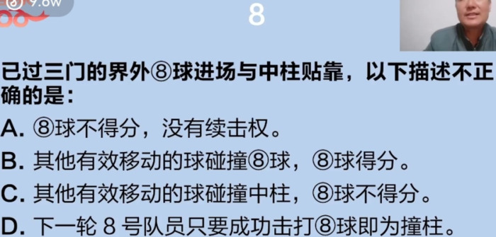 上善若水 发表于 2025-9-19 19:28 答案:C 已过三门的界外球进场撞击中柱,则撞中柱无效。若与中柱接触,其他有效移动球碰中柱造成该球移 ...