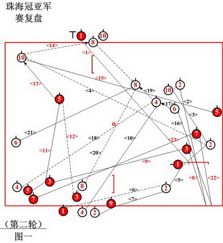 班门弄斧话“菏泽” 2010年珠海中冠赛,山东菏泽队以全胜记录挺进最后决赛,与厦门旭初队(白球)对垒。 ①球球进一门占二门一号位(不太理想)。②、③球放弃进一门;④球小进一门到三门零号位,因力稍大出界!⑤球进一门到四角(不太理想);⑥、⑦球一门留球。⑧球进一门落位近二线,击打①球命中!从零号位闪出,教练员指令⑧球到二门零号位。⑨球小进一门到三门零号位。⑩球进一门接应②球。第二轮,①球进场到一角,不巧碰到一门左门柱顿在近处。②球进一门擦打⑩球找①球方向,将⑩球闪送到三角处,再擦打①球,落位到三门后腰处,闪带⑨球不中,再撞⑨球时,却擦撞⑨球左边而自球出界。③球进一门接应⑤球且制角(比较理想)。④球进场接应⑥球进一门,落位在接应轨道中段。⑤球擦撞③球奔二门,不到位,只落位在二门与终点柱之间偏三线方向,闪送③球到三门前一号位近⑨球处,再击打⑩球,命中!闪带⑧球,⑩球出界且将⑧球挤到场内④球与二门之间,5号击球员看情况不妙,又企图打掉⑧球,遗憾未能命中,自球落位于一线边沿处。⑥球进一门打④球,闪送到四角待避,打⑧球闪送到三门③球处,自球到三线半与④球结组。⑦球小进门,击打⑧球不中,落位四角近④球处(见第二轮图一)。